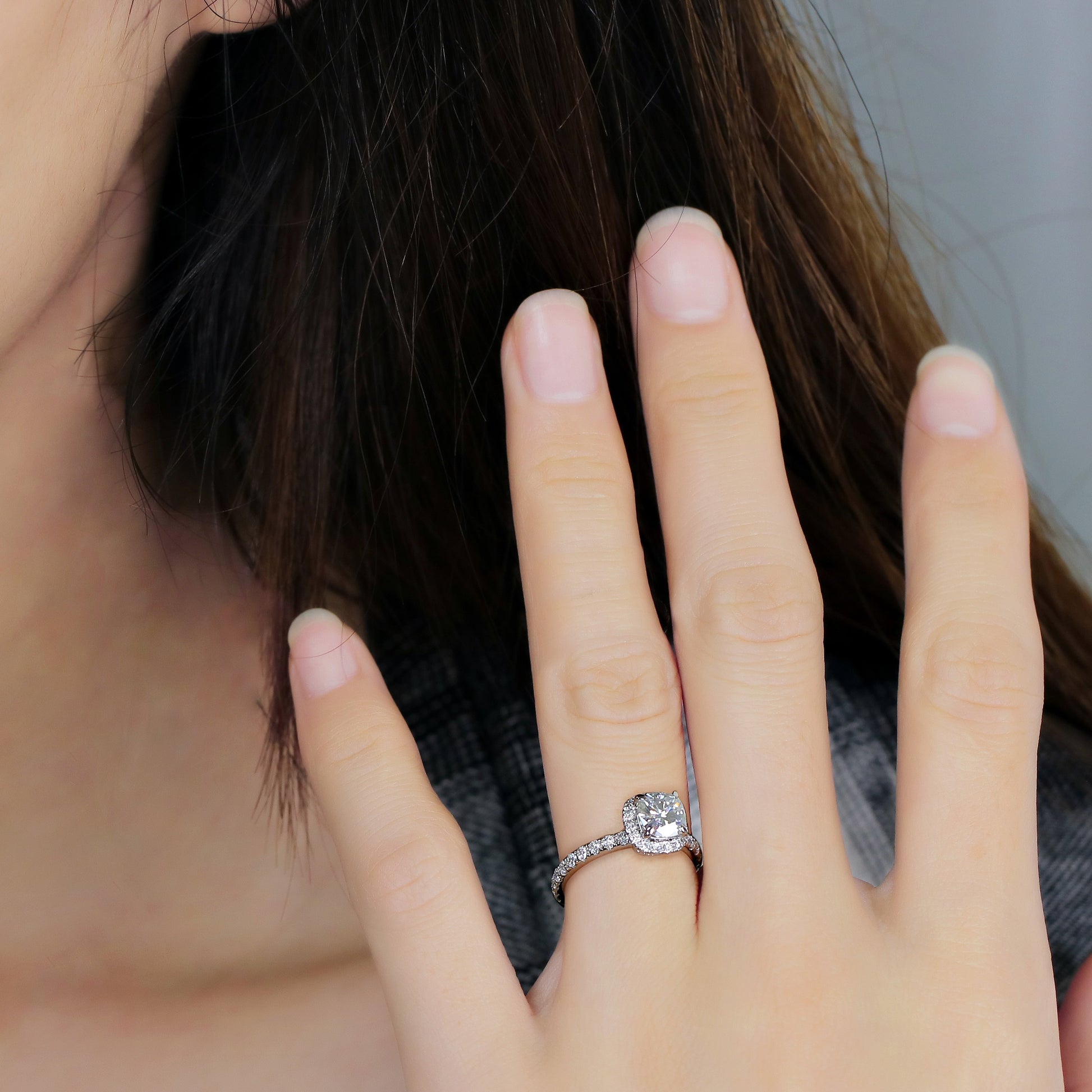 Moissanite Stone: The round center stone is 1 carat (6.5mm). This moissanite engagement ring also has additional moissanite stones along the silver band and surrounding the main stone.