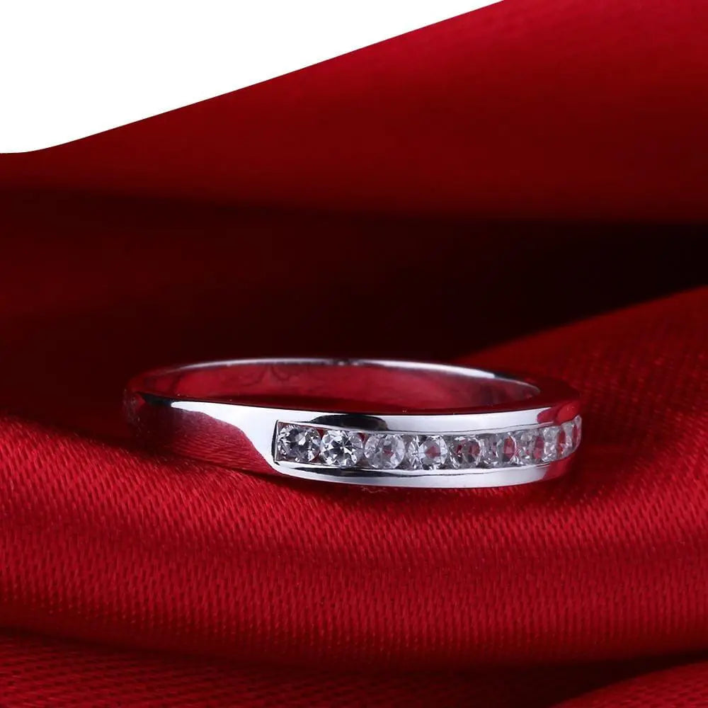 Stone Size: The center stone to this moissanite anniversary band / half eternity ring is 0.4 carat total.