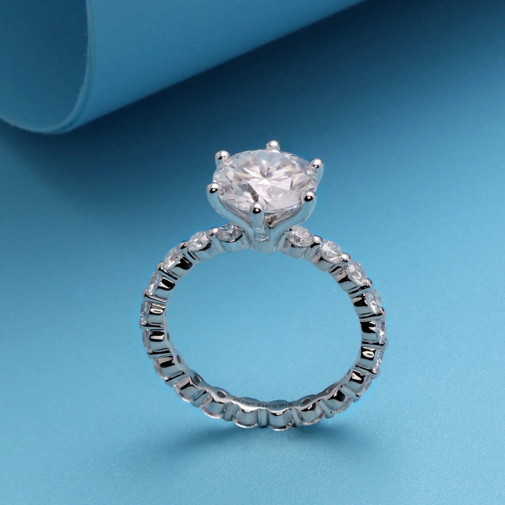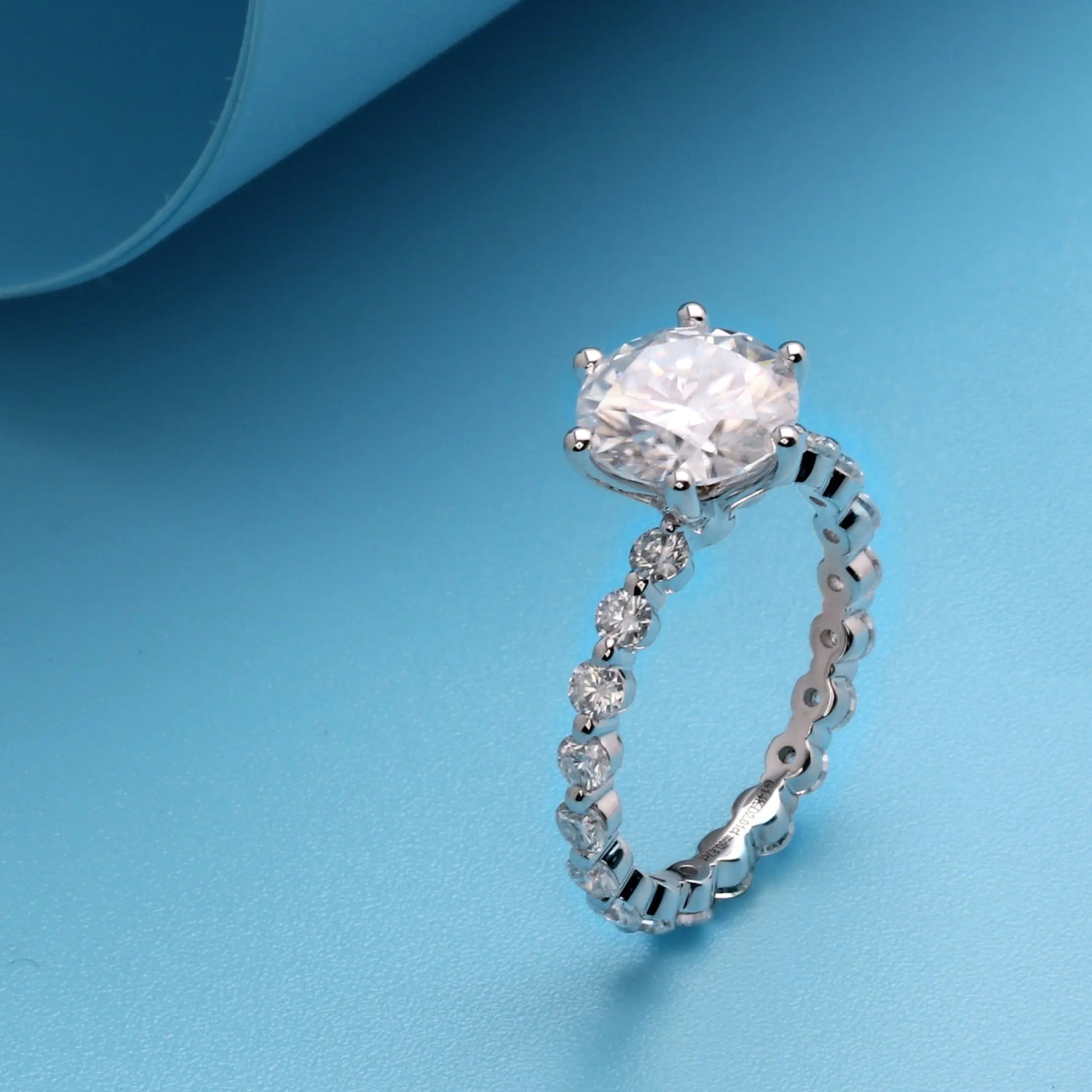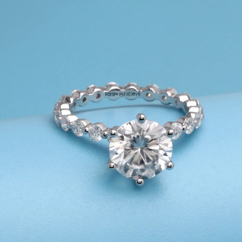 Stone Size: This eternity style moissanite engagement ring has a 2 carat (8mm) center stone. The moissanite accents are 2.2mm each.