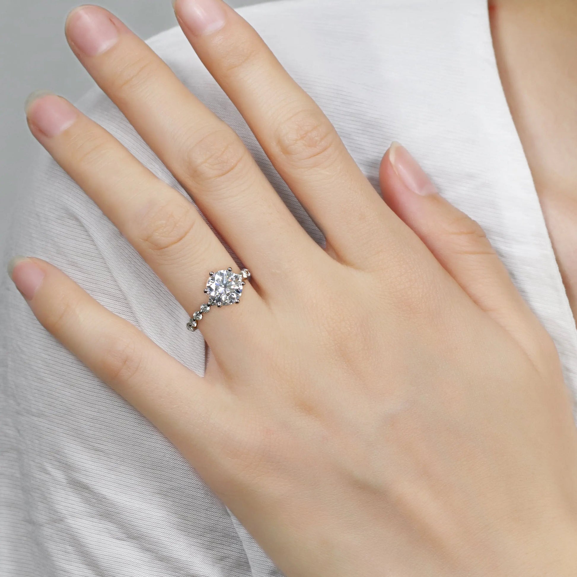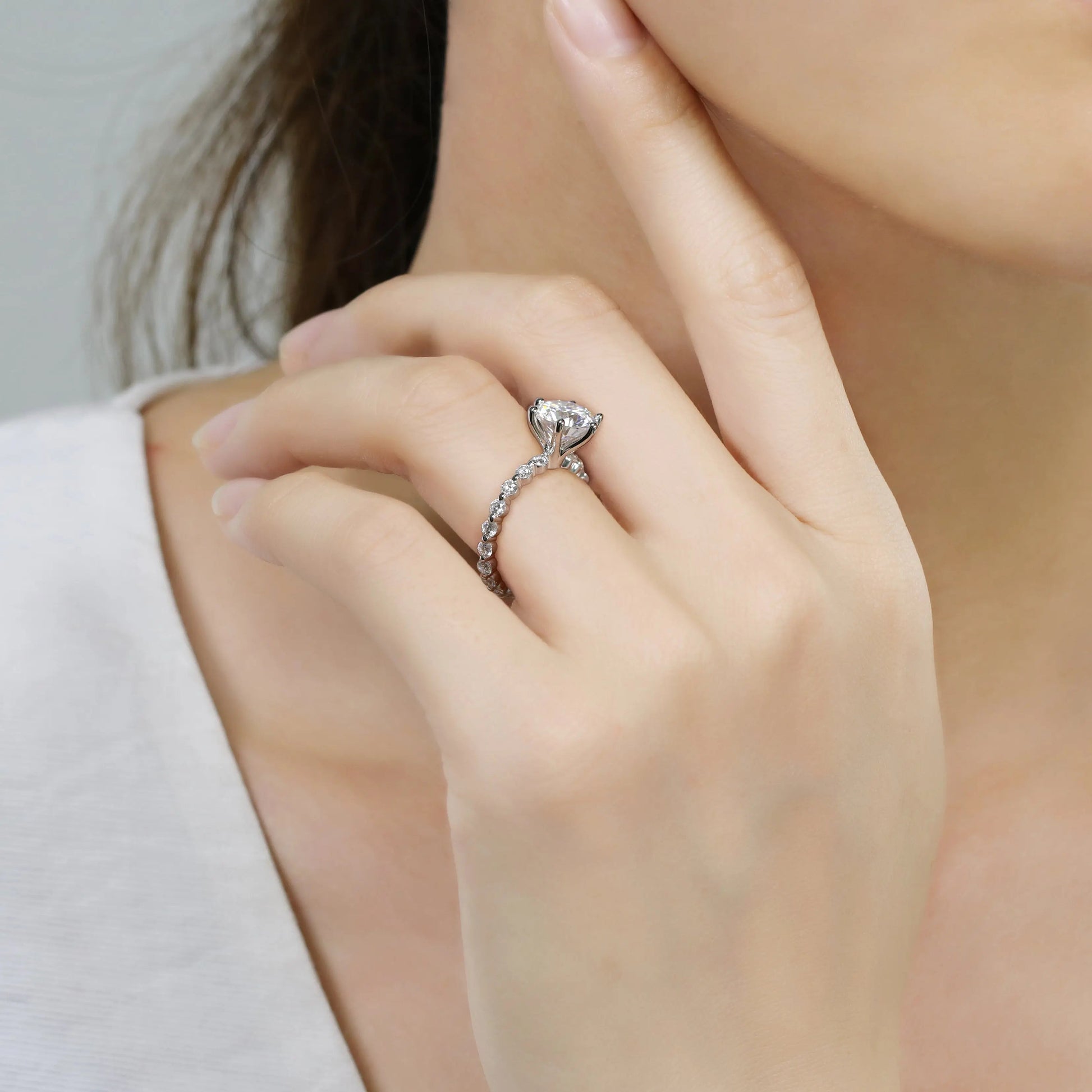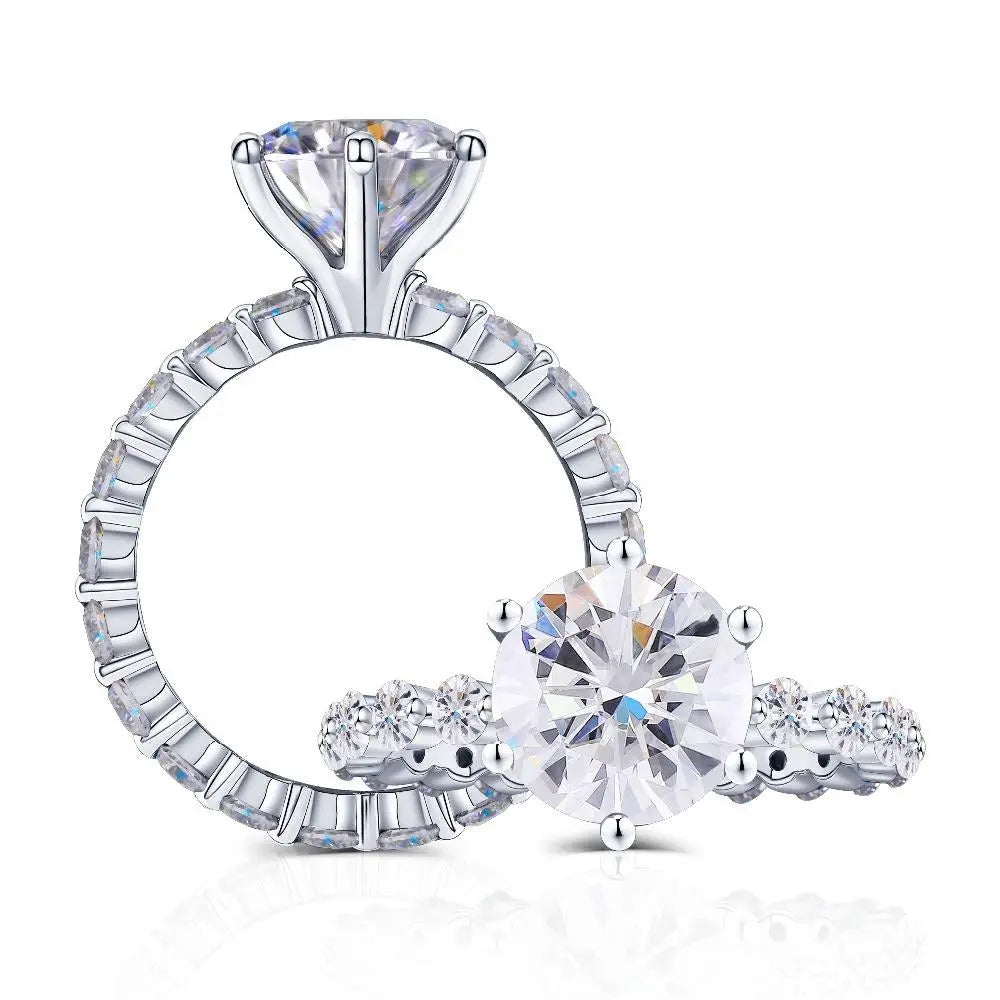 Stone Size: This eternity style moissanite engagement ring has a 2 carat (8mm) center stone. The moissanite accents are 2.2mm each.