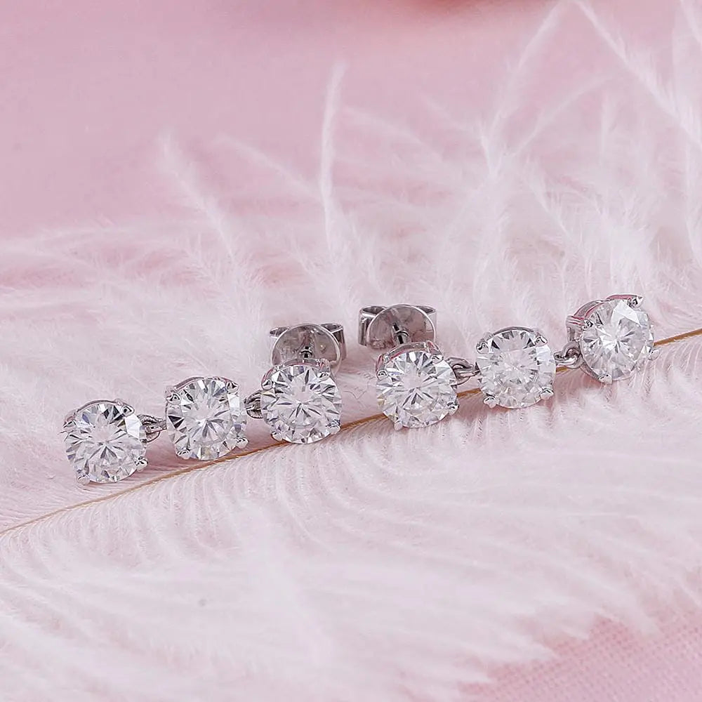 These earrings feature DE colorless. FL-VVS1 moissanite stones. renowned for their superior clarity and sparkle. Each stone is expertly cut for maximum brilliance. with a size of 0.5 carat (5mm) per stone. The total carat weight is an impressive 3 carats for the pair. making them a show-stopping accessory.