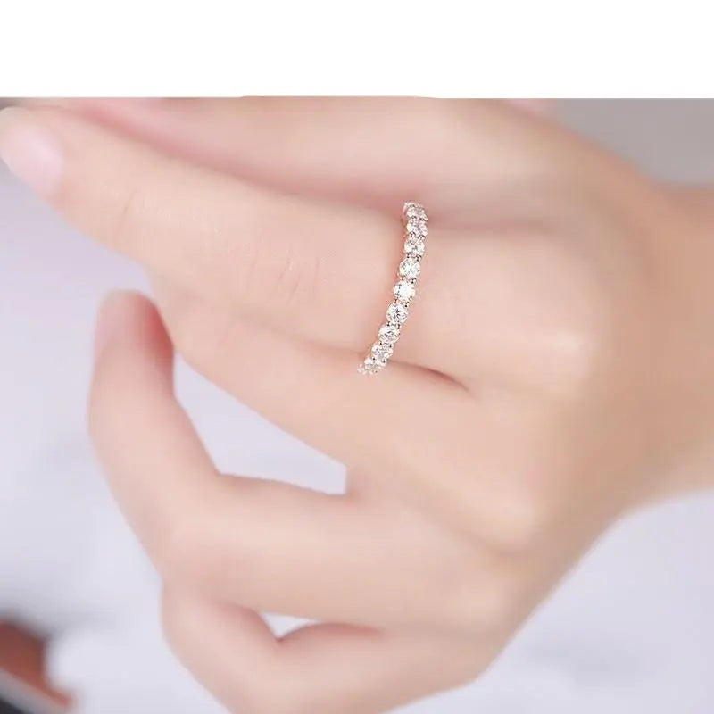 Stone Size: The stones to this moissanite anniversary ring / wedding band are 0.06ct each (2.5mm). Total carat weight is about 0.8 carat.