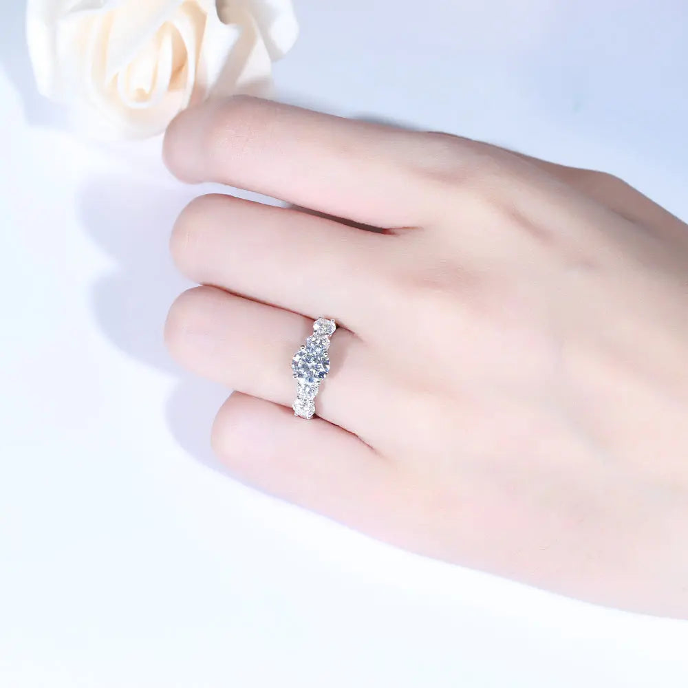 Stone Size: This moissanite wedding band's center stone is 1 carat (6.5mm). It also has four additional stones that are 0.25ct (4mm) each. The total carat weight of the ring is 2 carat.