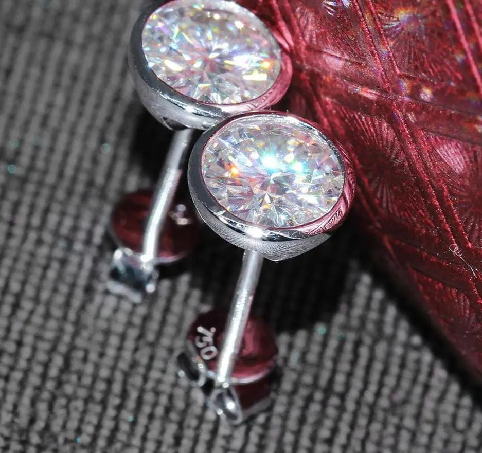 These bezel set earrings showcase DE colorless moissanite stones. known for their superior clarity and exceptional sparkle. The FL-VVS1 clarity and excellent cut ensure these stones shine with a brilliance that rivals the finest diamonds. Each stone measures 1 carat (6.5mm). offering a substantial yet elegant presence. With a total carat weight of 2 carats for the pair. these earrings make a statement of elegance and sophistication.