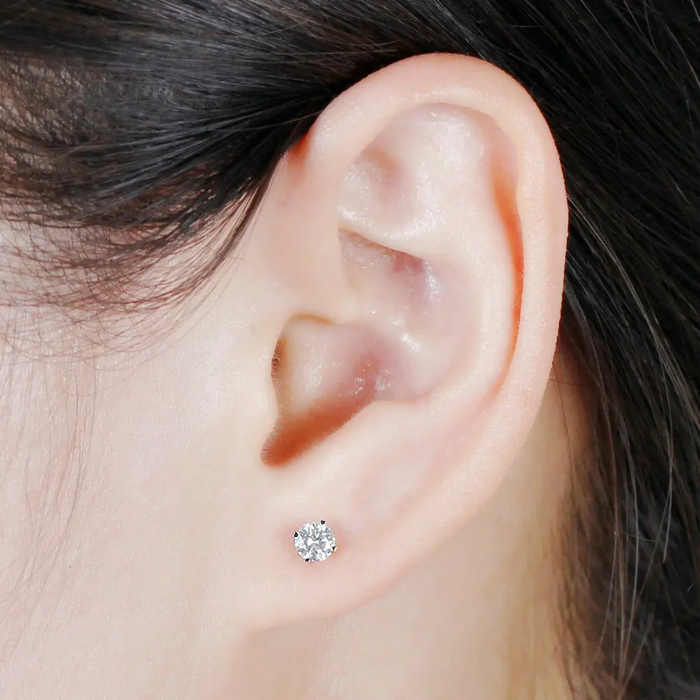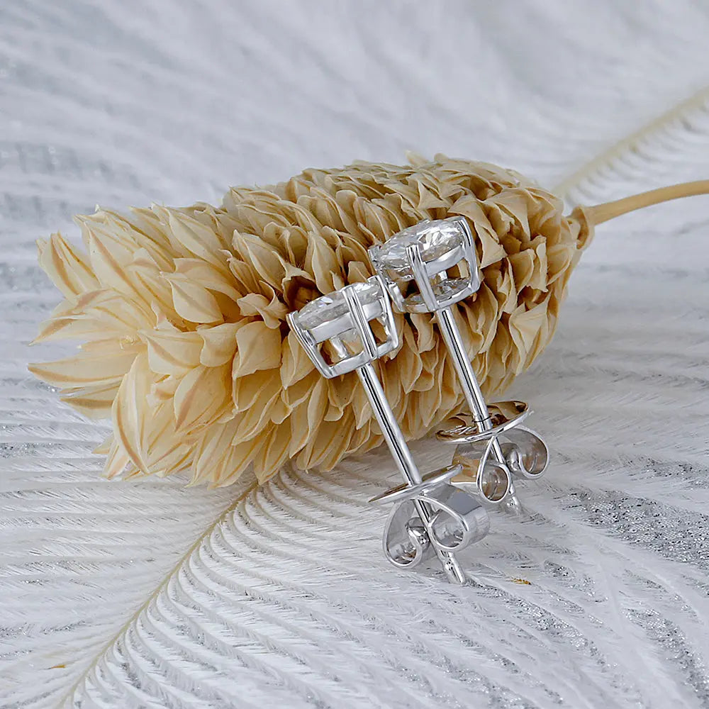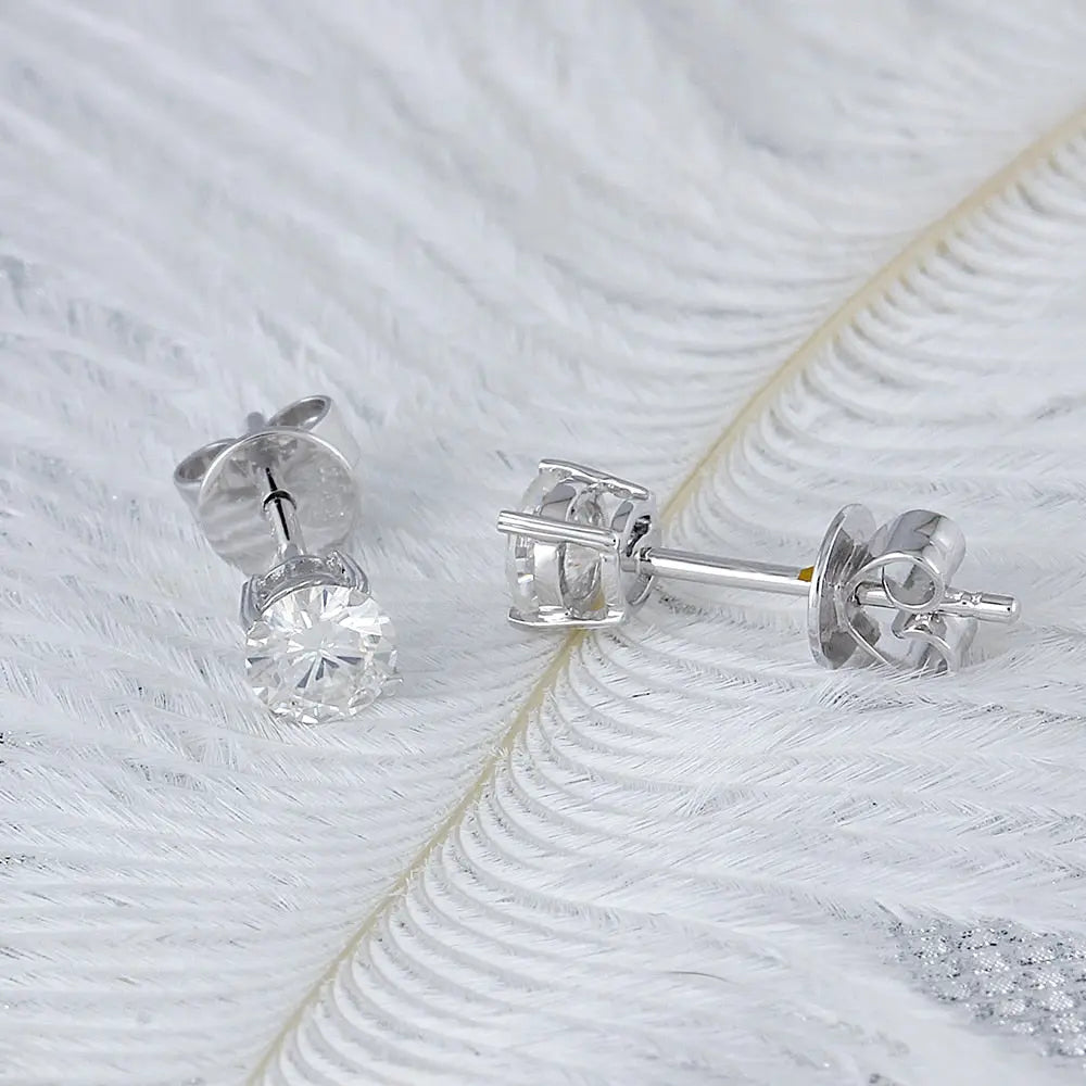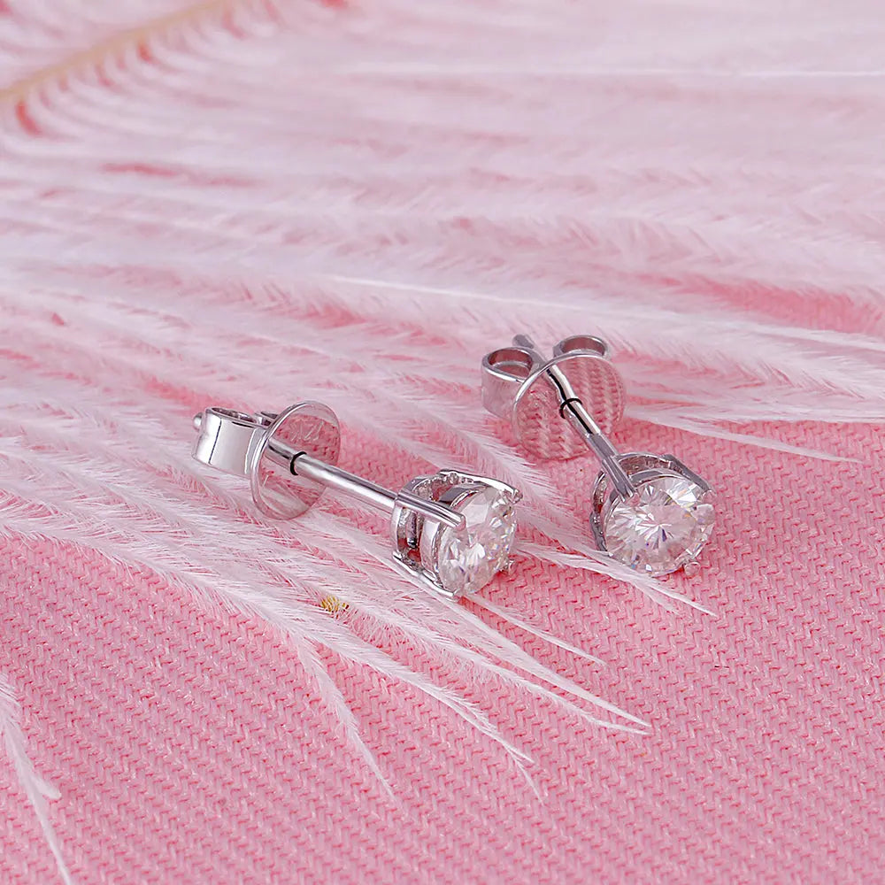 Crafted from high-quality 14k gold. these earrings come in three metal options: white gold. rose gold. and yellow gold. This range lets you personalize your choice to match your skin tone or style preference. ensuring the earrings fit seamlessly into any collection. The 4-prong stud setting keeps each moissanite stone secure while enhancing the stone's sparkle from every angle. With a push-back closure. these earrings provide both security and comfort for daily wear.