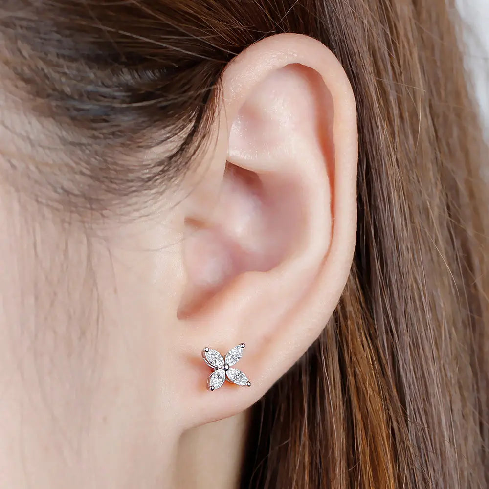 Each earring is adorned with two dazzling marquise cut moissanite stones. measuring 4x2mm and weighing 0.10 carat each. for a total carat weight of 0.8ctw for the pair. The unique marquise cut of these stones enhances their brilliance and creates an illusion of elongated elegance. ensuring that they catch the light beautifully. The moissanite stones are of the highest quality. graded as DE colorless and FL-VVS1. which means they possess exceptional clarity and are expertly cut to maximize their sparkle.