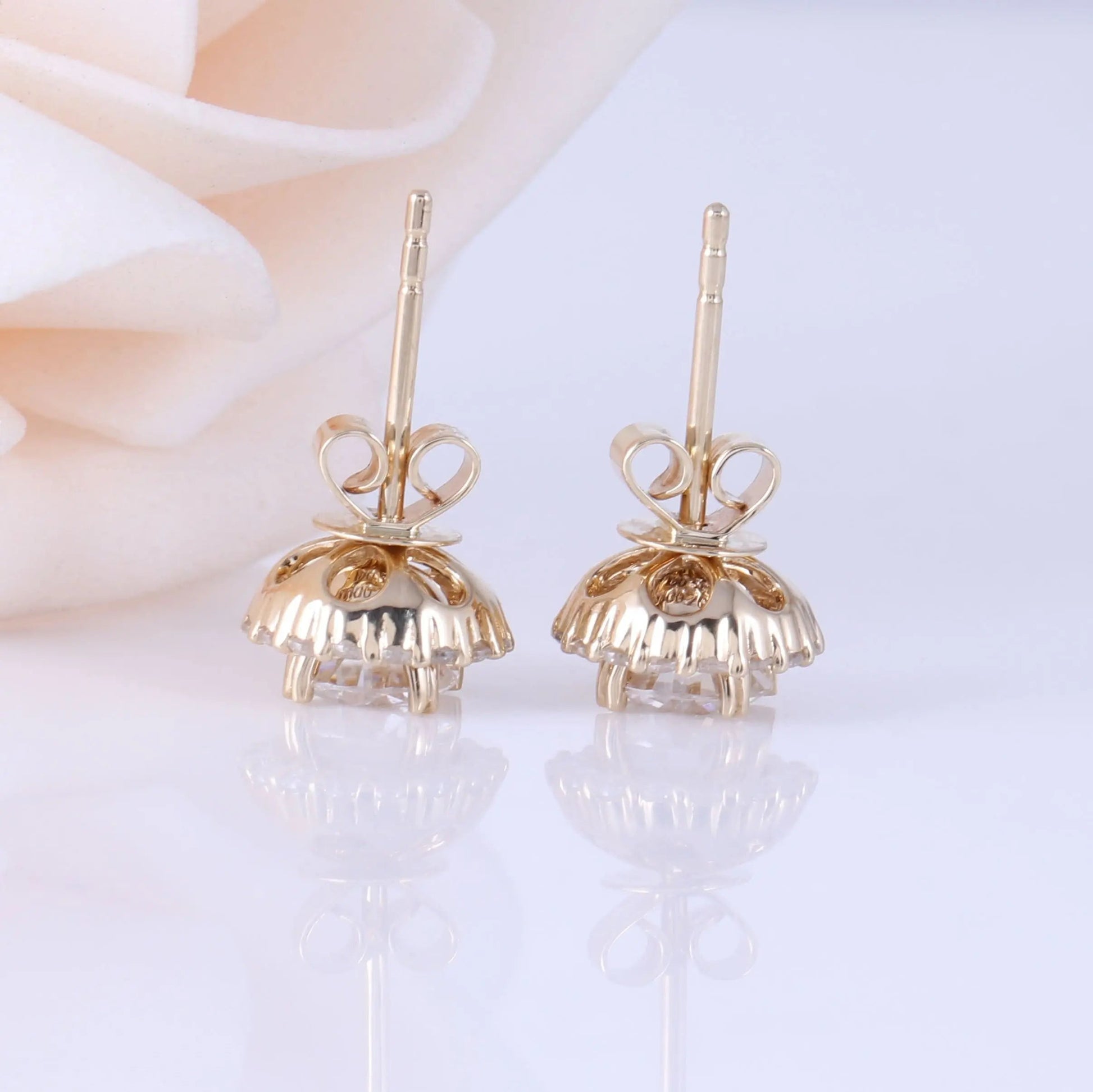 - Halo Design in Yellow Gold: The halo design enhances the sparkle of the center stones while adding a touch of luxury. Set in 14K yellow gold. these earrings exude warmth and sophistication. making them ideal for various occasions.