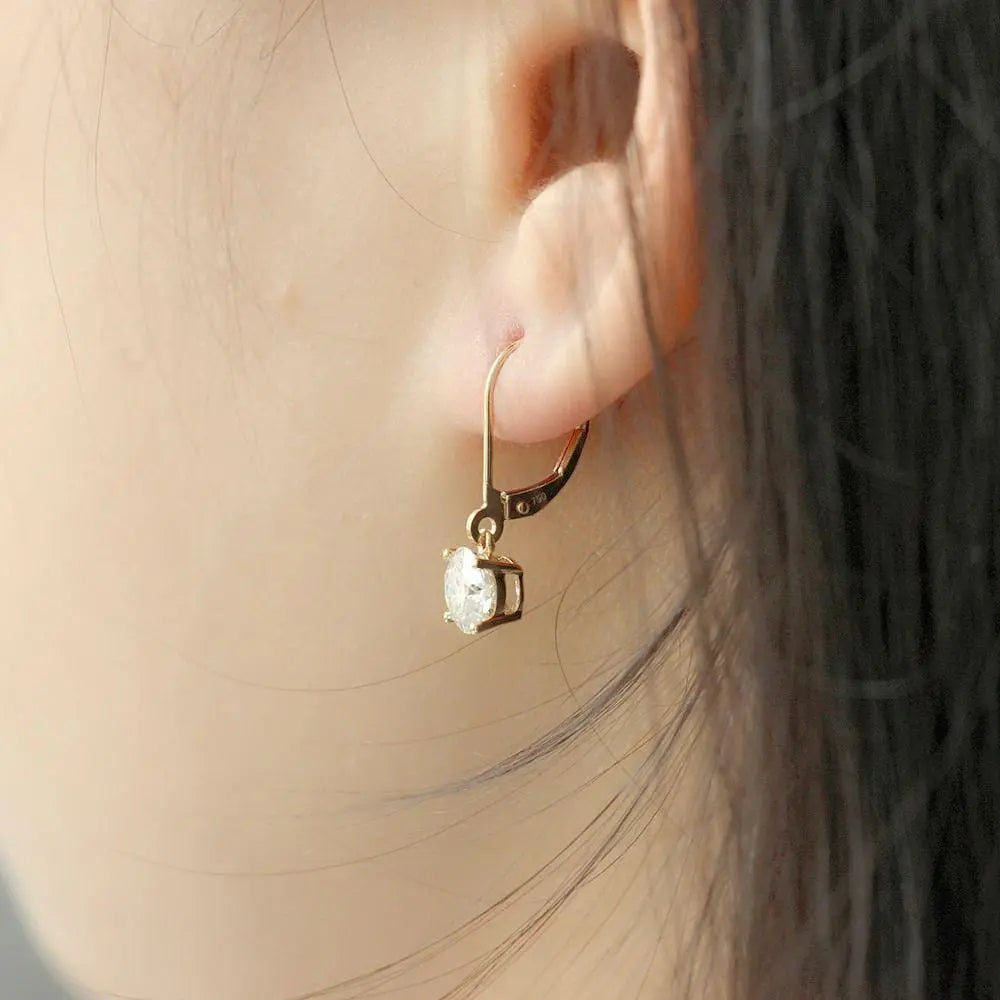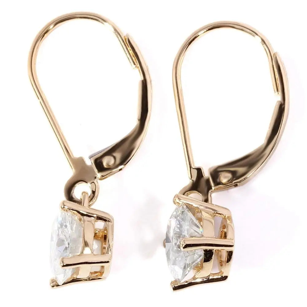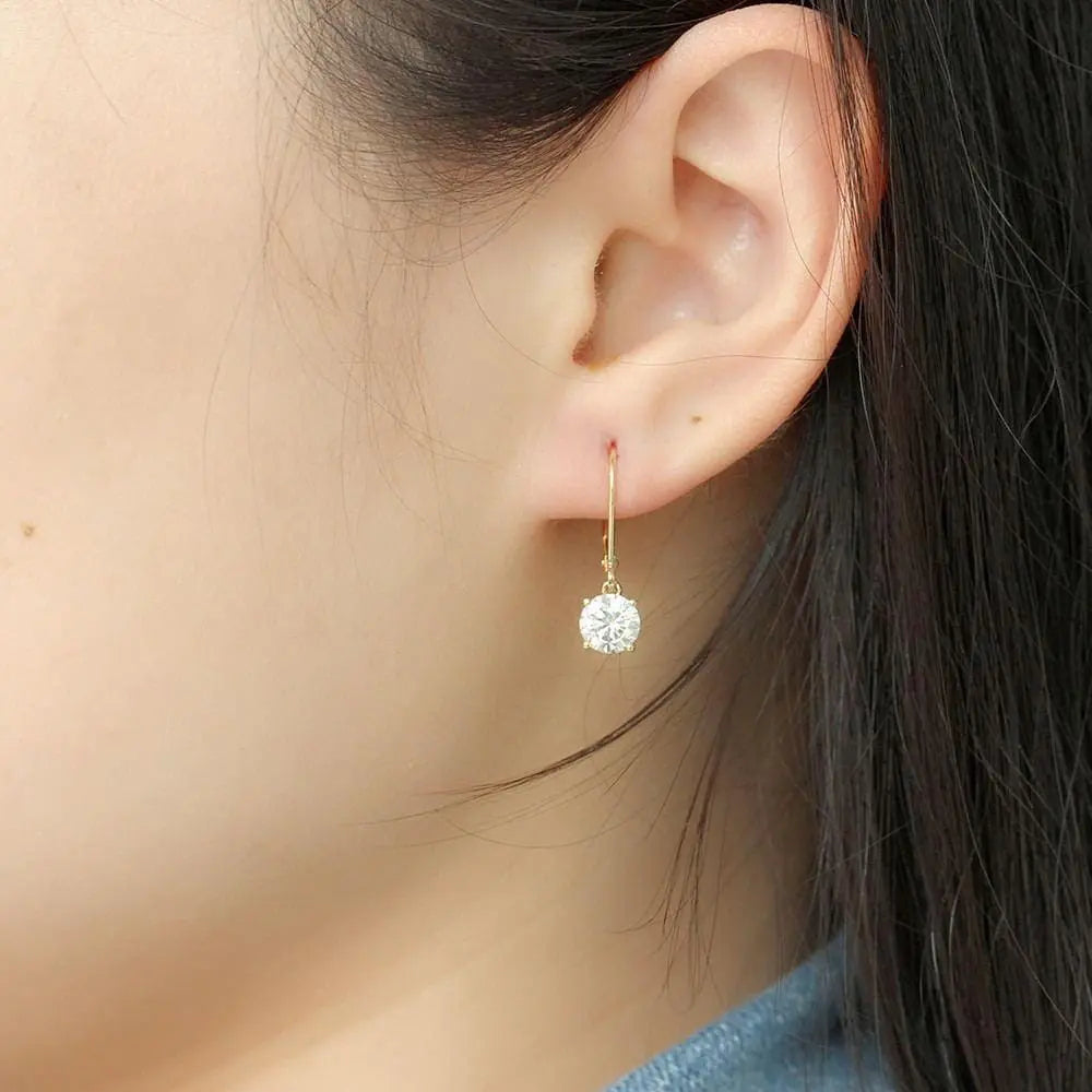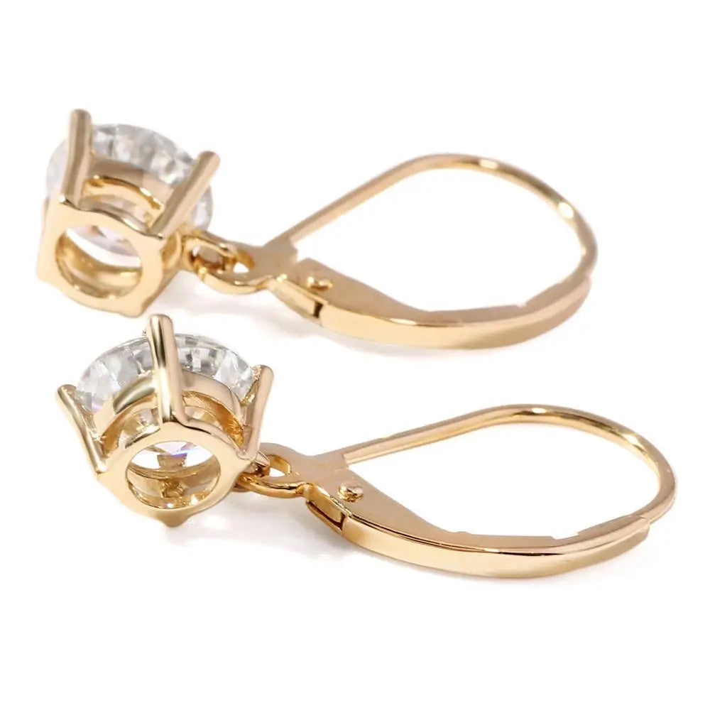 - Exceptional Moissanite Stones: These cute hanging earrings showcase round-cut moissanite stones. each weighing 1 carat. for a total of 2 carats for the pair. The stones boast DEF color and FL-VVS1 clarity. offering exceptional brilliance and sparkle that rivals diamonds.