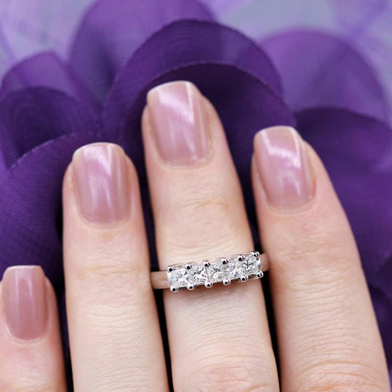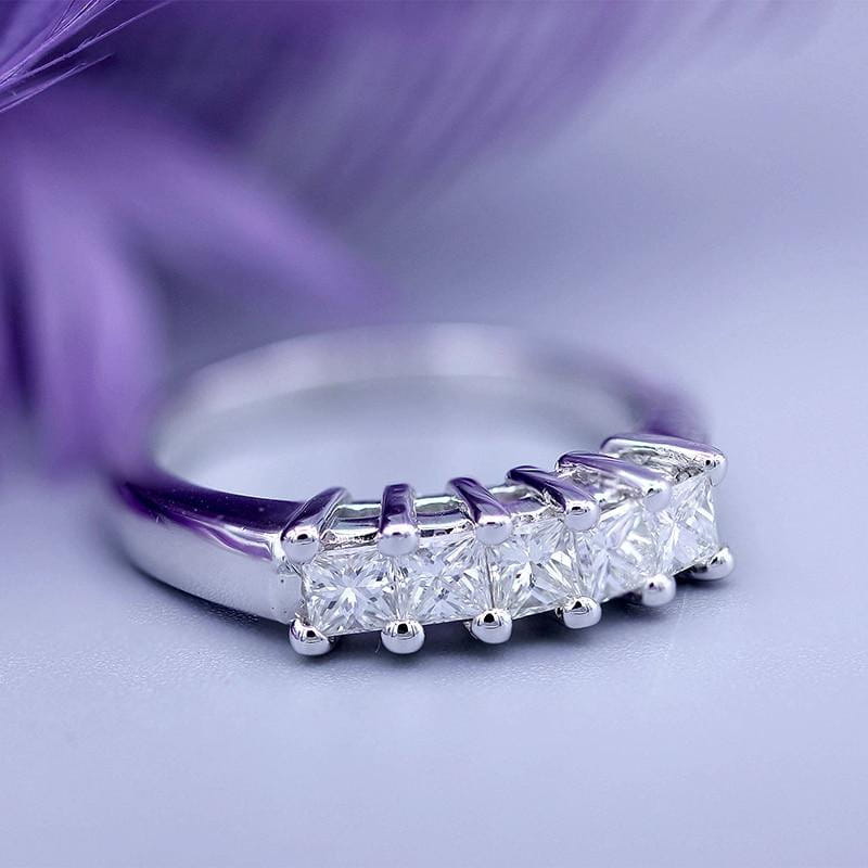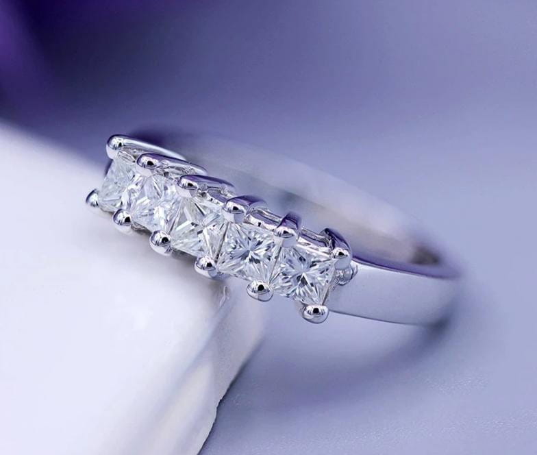 This princess cut 5 stone moissanite wedding band / ring features five. 2mm moissanite diamonds. It makes for a fantastic moissanite gift to yourself or someone you love.