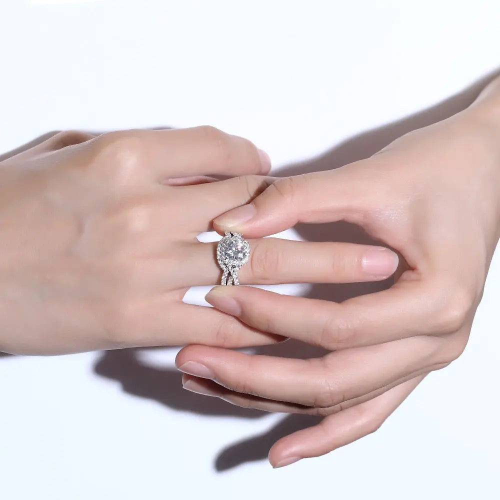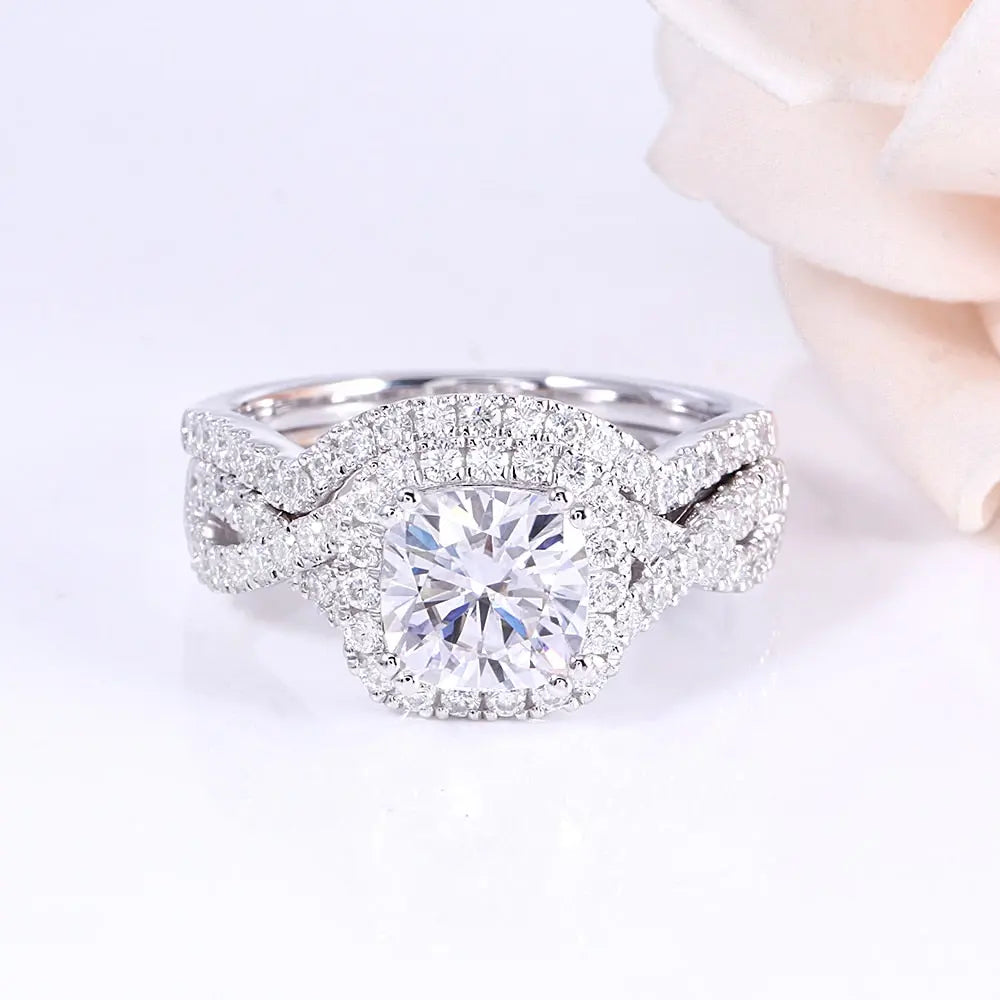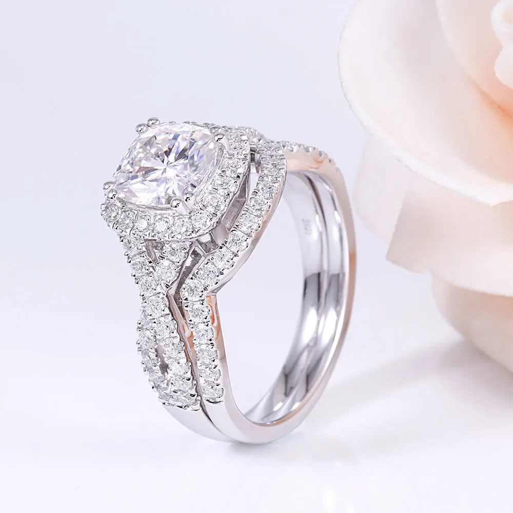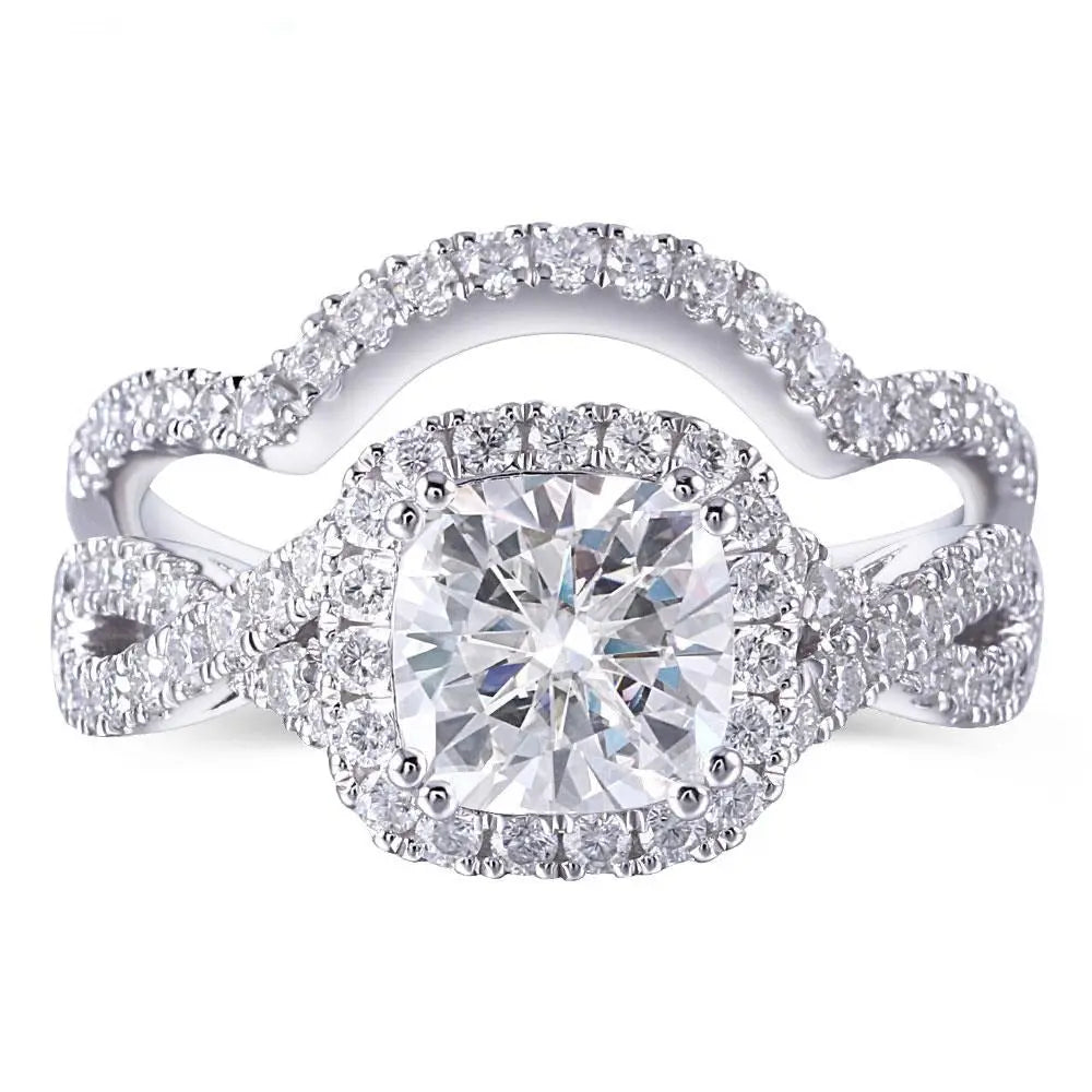 The centerpiece of this Moissanite Bridal Set is a gorgeous 2-carat cushion-cut Moissanite stone securely held within a halo setting that enhances its brilliance. Surrounding the central stone. additional smaller stones totaling 0.8 carats amplify the radiance. creating a dazzling display perfect for marking such a special occasion. Included in this set is a half-eternity or anniversary band designed to complement the engagement ring beautifully and symbolize enduring love. Each ring is crafted with platinum-plated silver. a choice that adds durability while offering a high-end look at an affordable price.