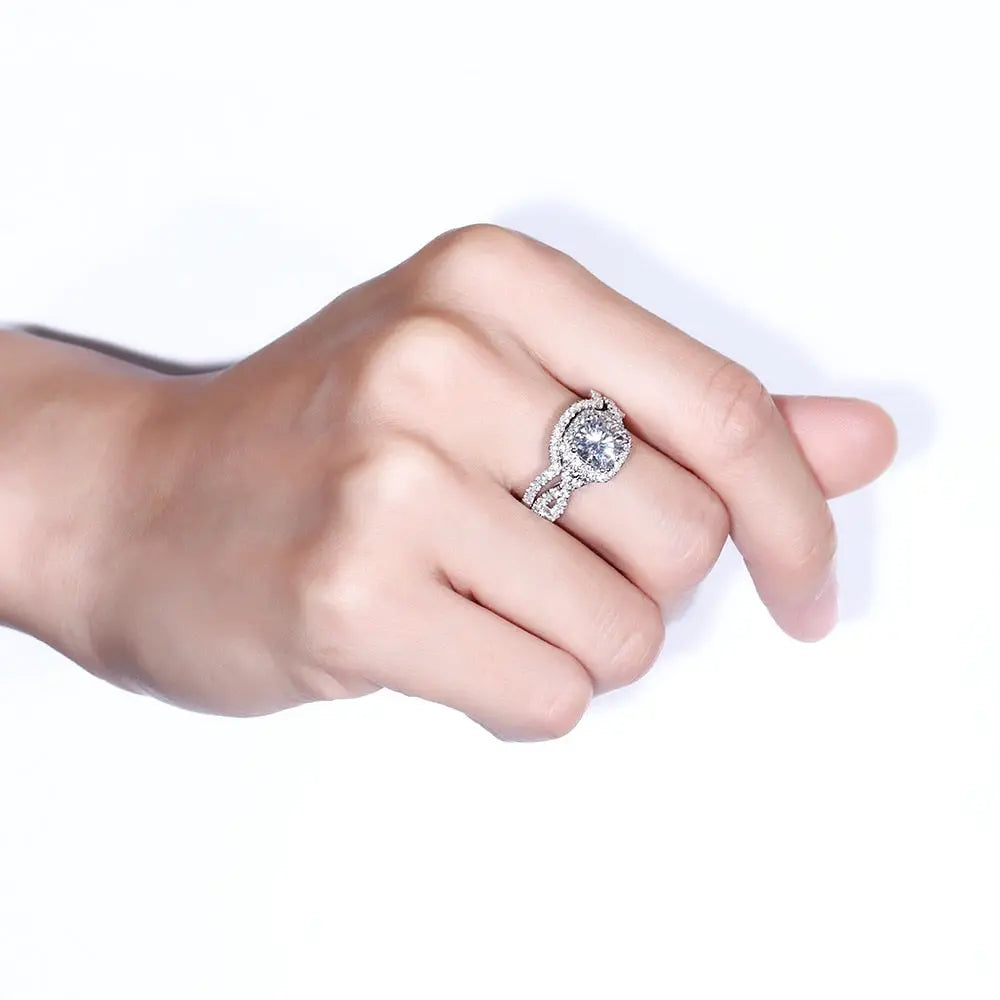 Discover the elegance of our Moissanite Bridal Set. a stunning two-piece set crafted with platinum-plated 925 silver. featuring a total of 2.8 carats of brilliant Moissanite stones. Perfect for the modern bride seeking sophistication and value. this Moissanite Bridal Set offers the luxurious appeal of a traditional diamond set without the steep price tag. With DE colorless Moissanite stones that are FL-VVS1 clarity and an excellent cut. this set dazzles with an unmatched sparkle.