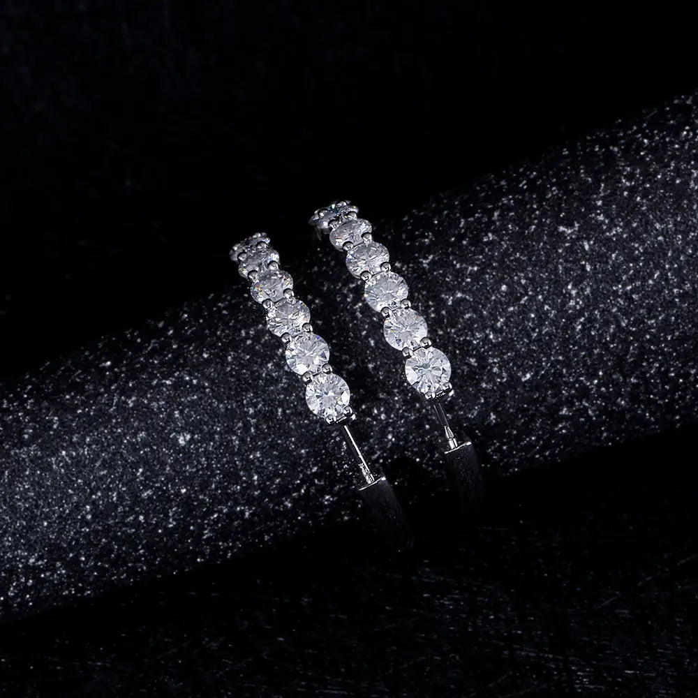 What sets these earrings apart is their exceptional Moissanite stones. With 20 total stones. each 0.17 carat. these earrings boast a total carat weight of 3.4 carats. The DE colorless Moissanite stones are expertly cut to an excellent standard. offering a dazzling sparkle that rivals diamonds. With a clarity grade of FL-VVS1. these stones are virtually flawless. ensuring maximum brilliance.