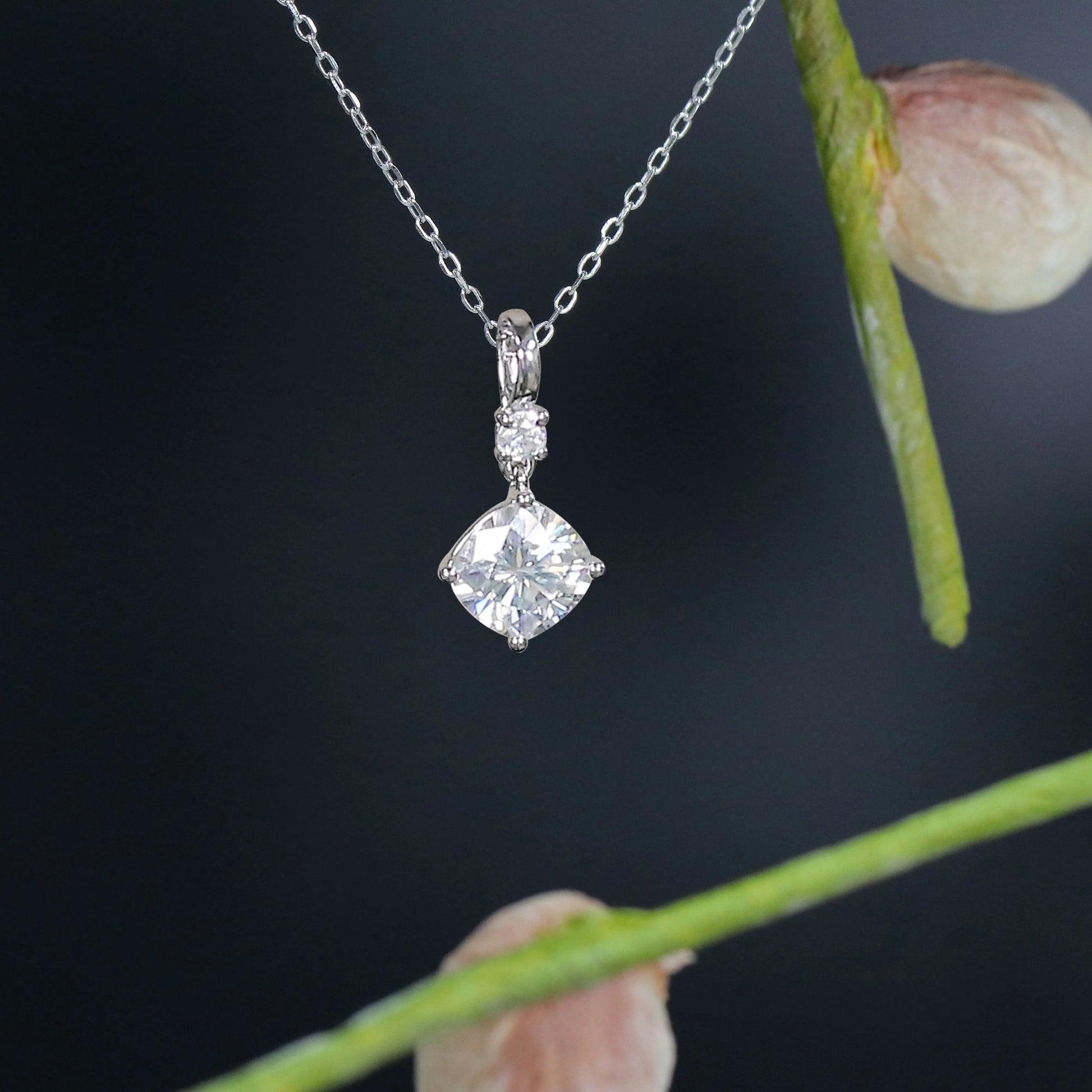 Stone Size: The main stone to this moissanite necklace is 2ct (7.5mm). The smaller stone is 0.1ct (3mm)