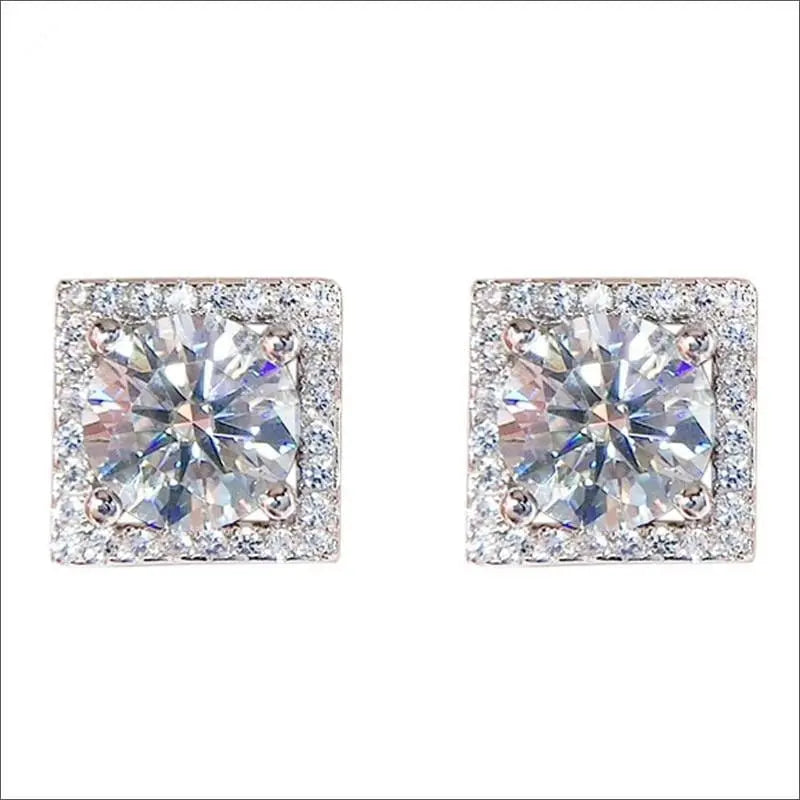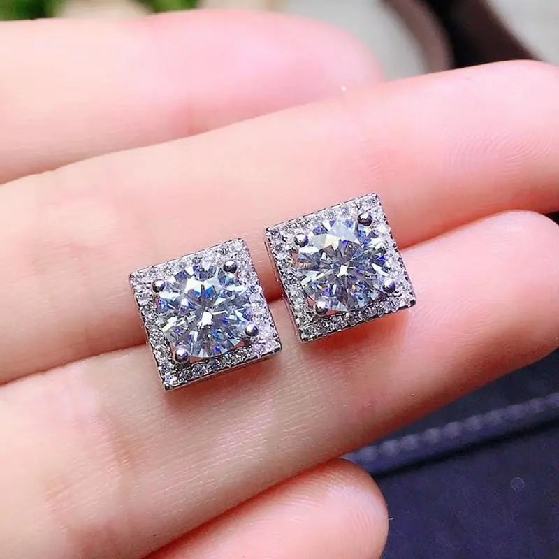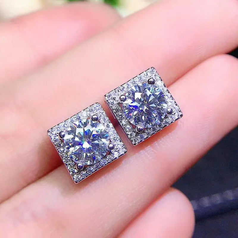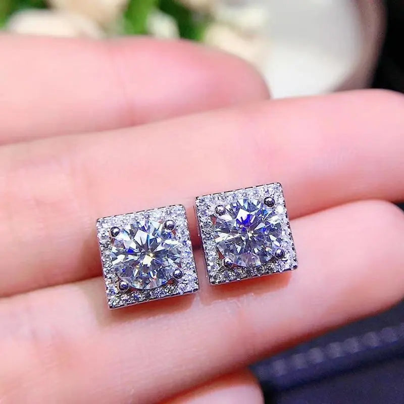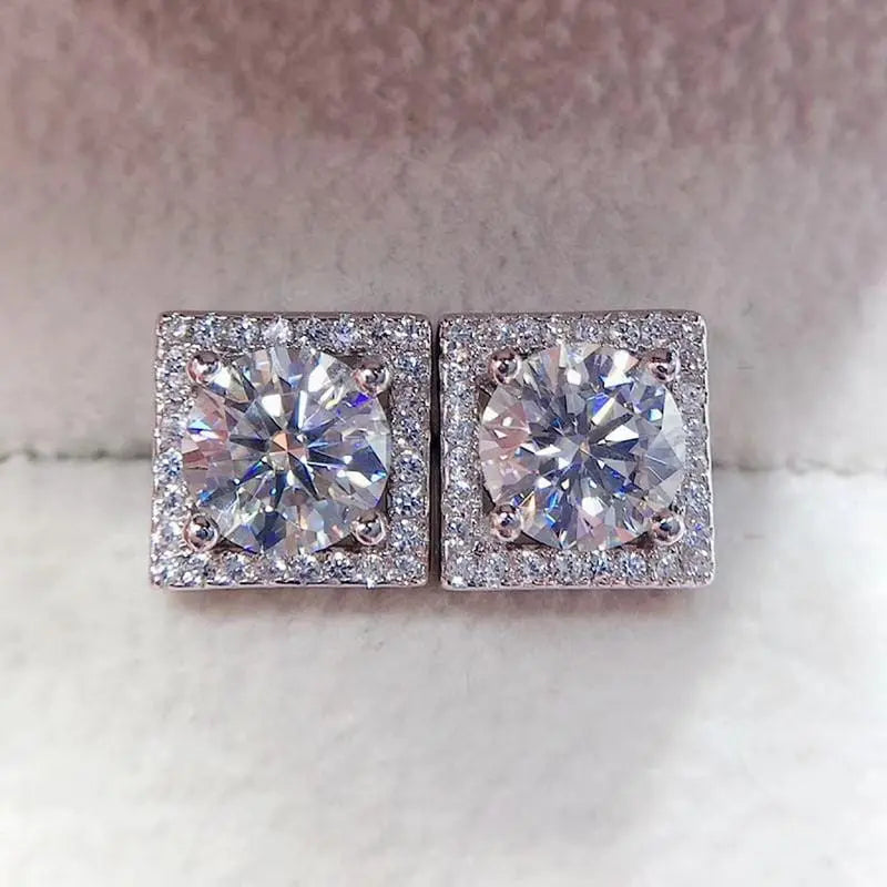 Add a touch of luxury and sparkle to your jewelry collection with these stunning Halo Moissanite Earrings. The perfect combination of timeless elegance and modern design. these earrings feature a classic round-cut Moissanite stone set within a square halo design. making them a statement piece that will stand out on any occasion.
