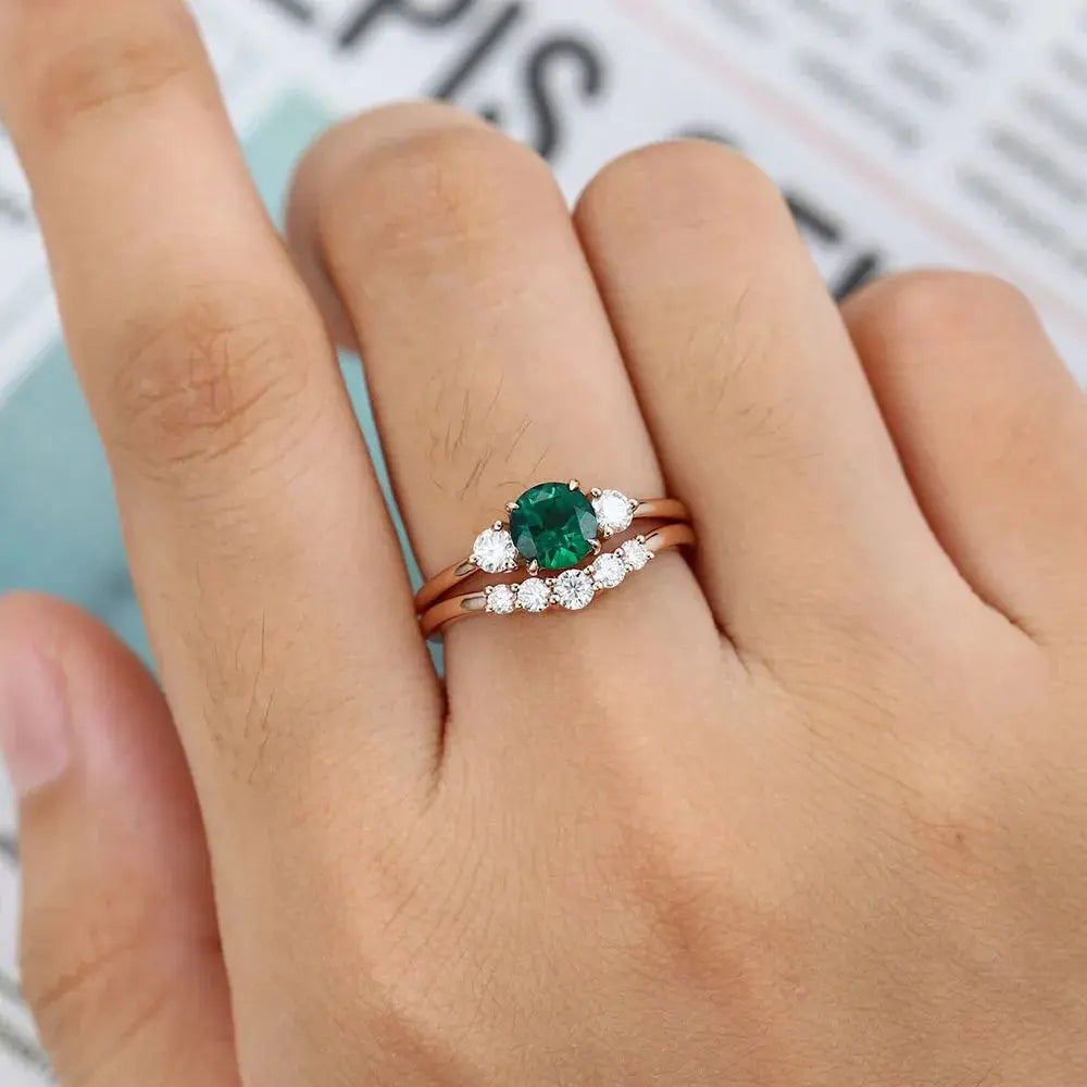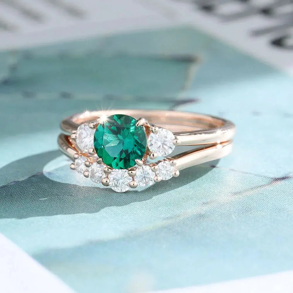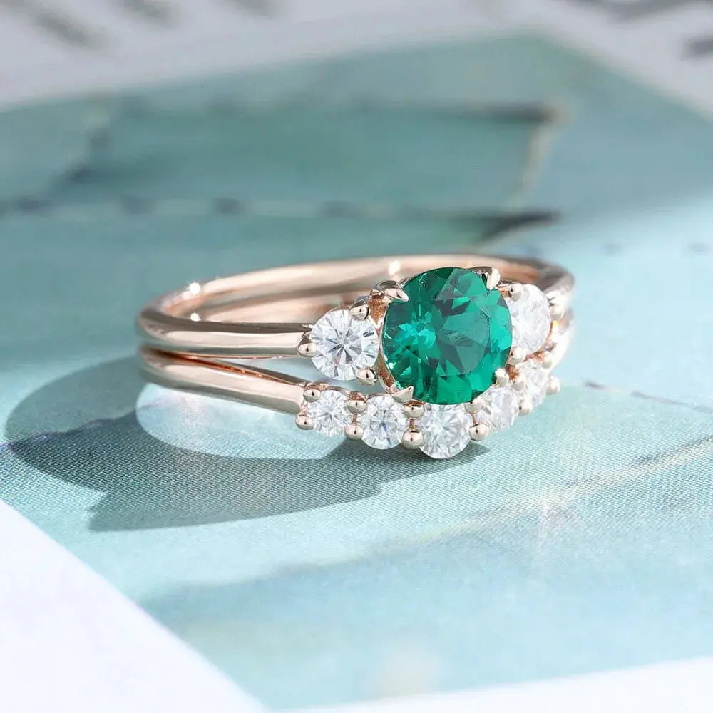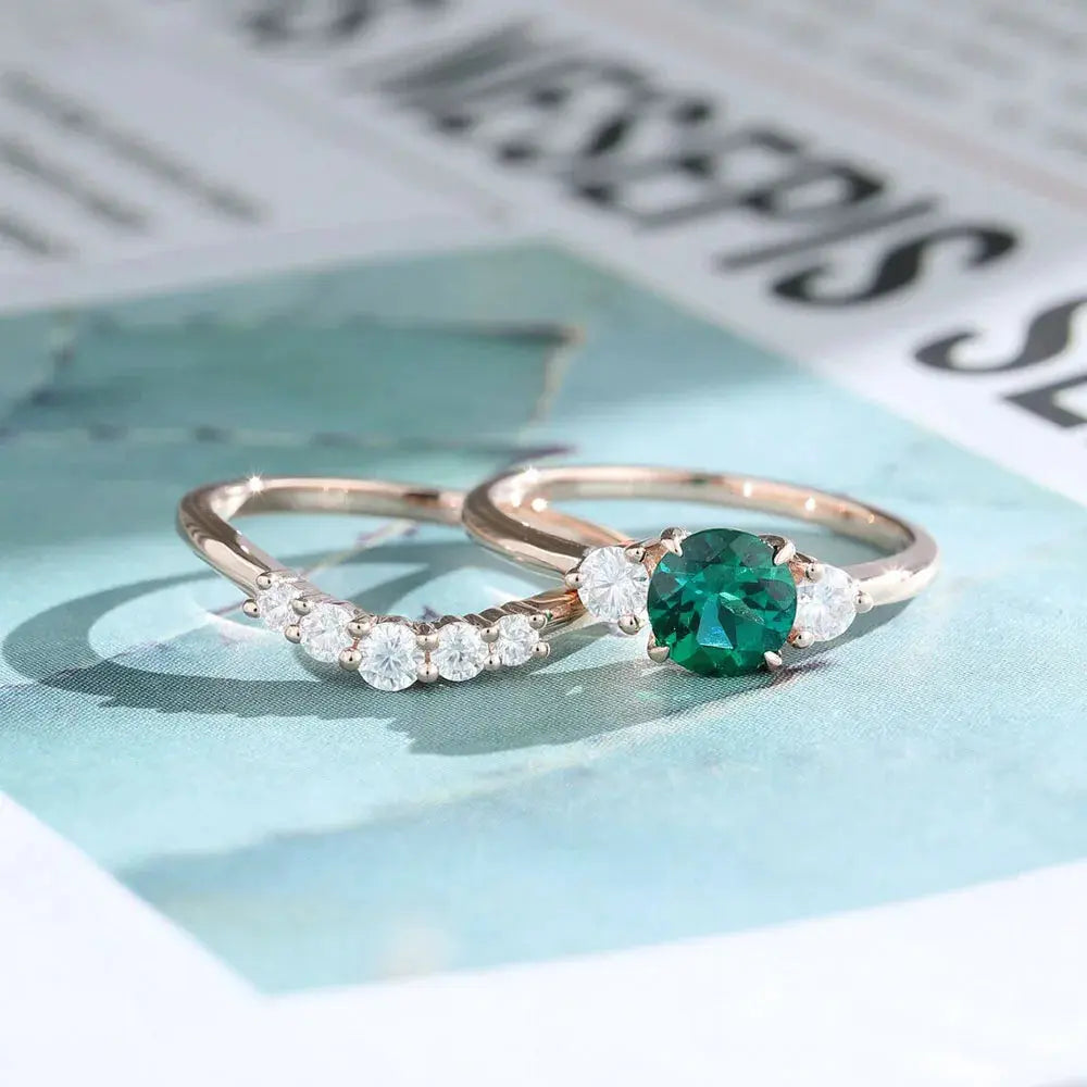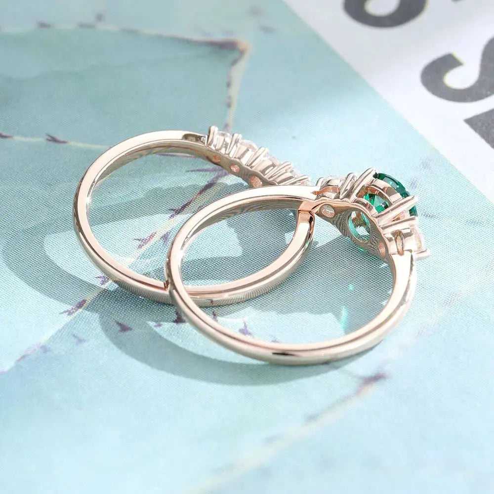 Rose Gold Emerald Three Stone Moissanite Bridal Set