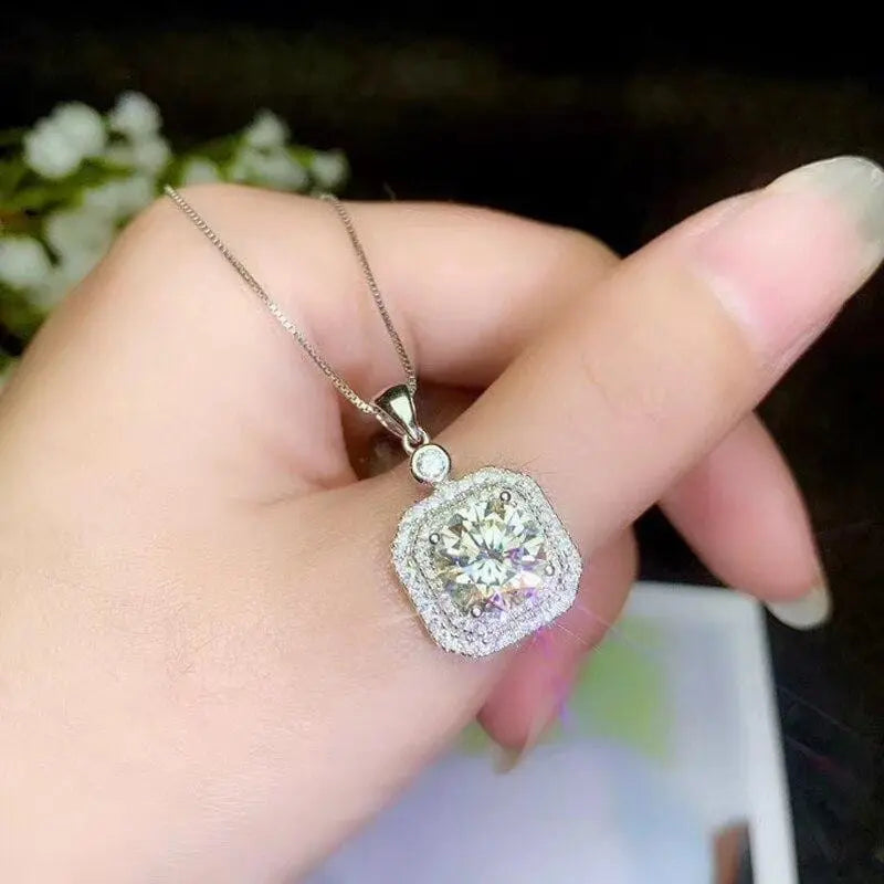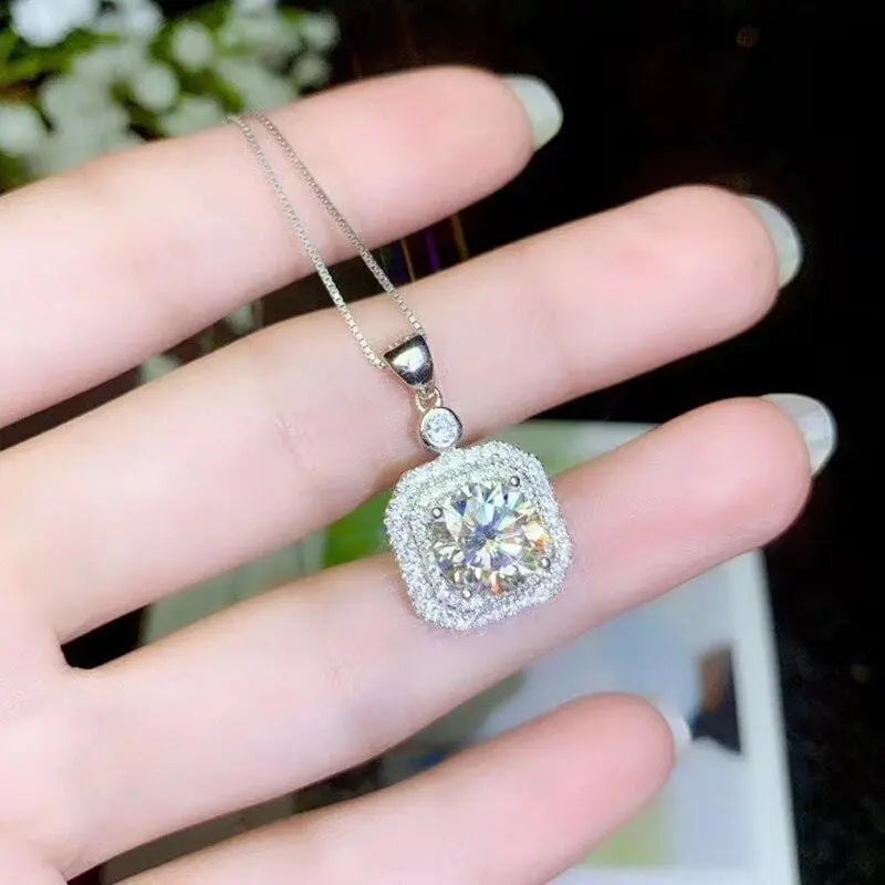 Elevate your jewelry collection with the dazzling Silver With White Gold Plating Double Halo Moissanite Necklace. With options ranging from 1 to 3 carats. this necklace is a versatile statement piece that exudes sophistication and elegance.
