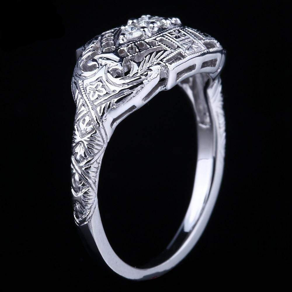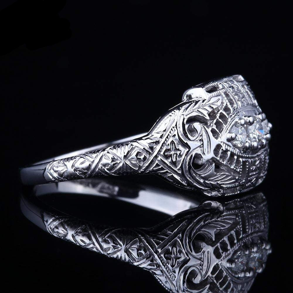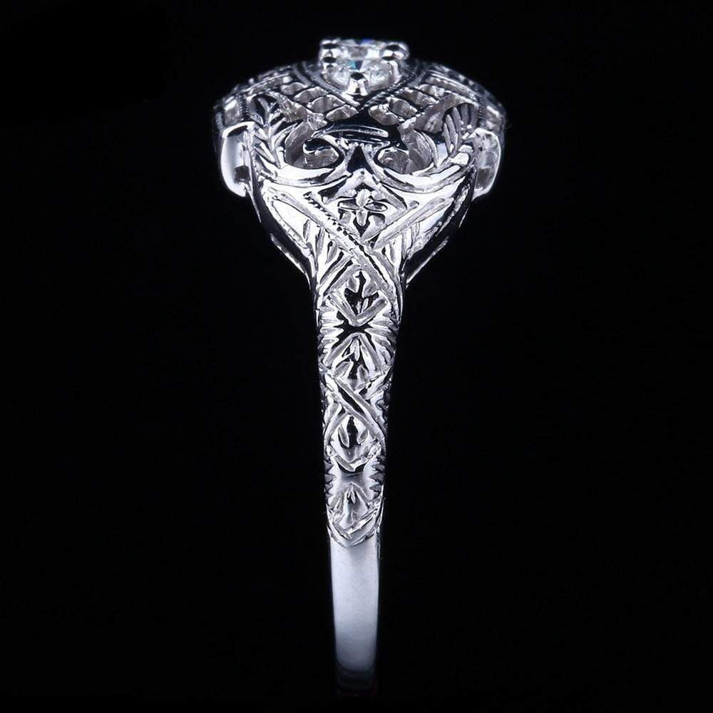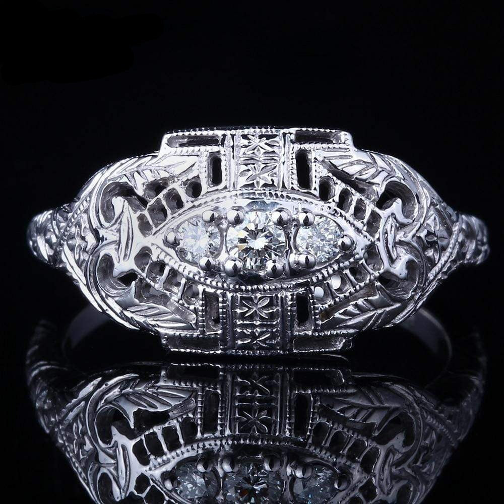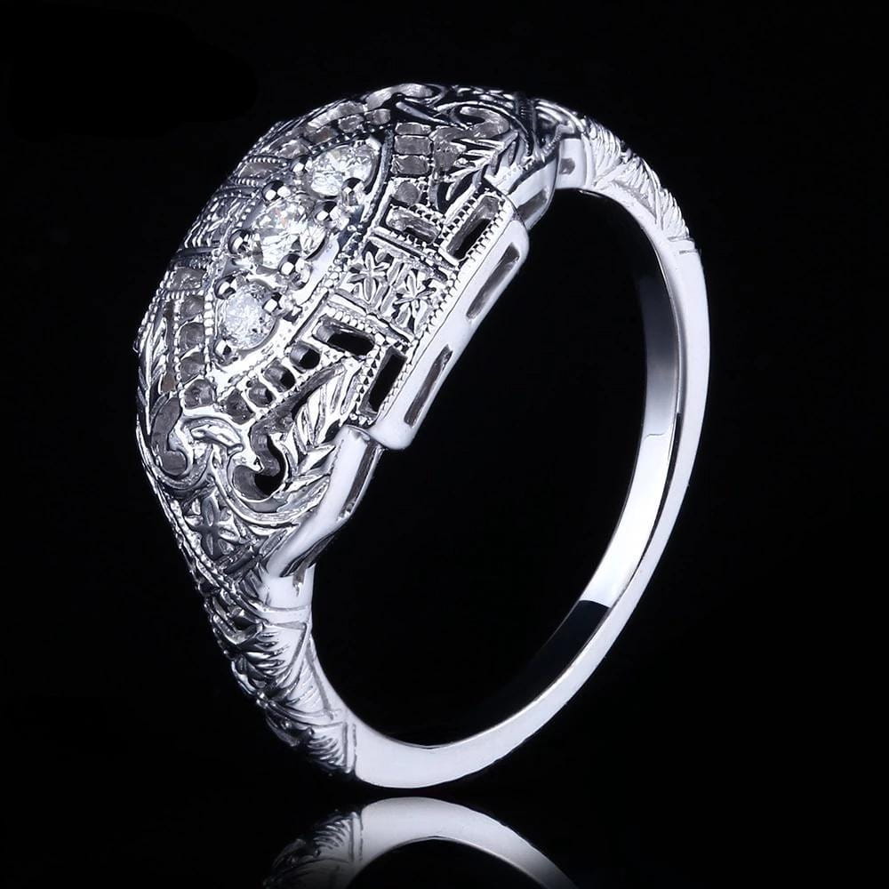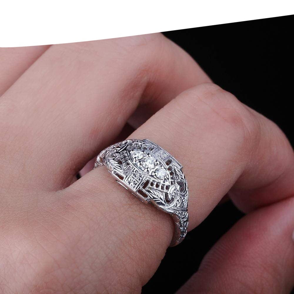 This vintage style moissanite ring is one of a kind. It features 3 small. brilliant moissanite stones in an intricate silver band. We're proud to be able to find such a rare design sold exclusively here in our store.