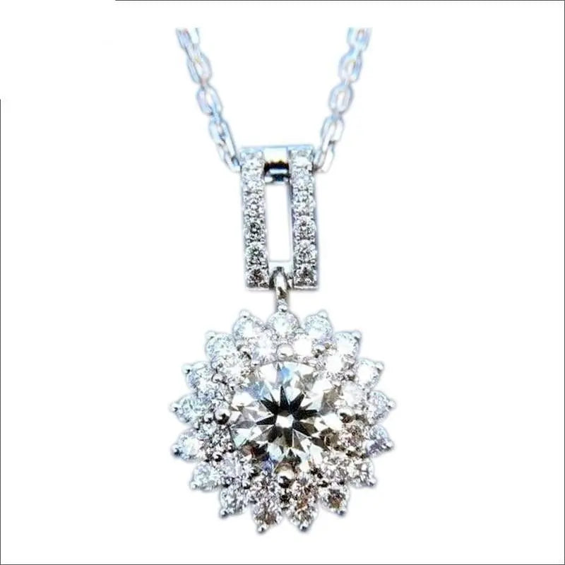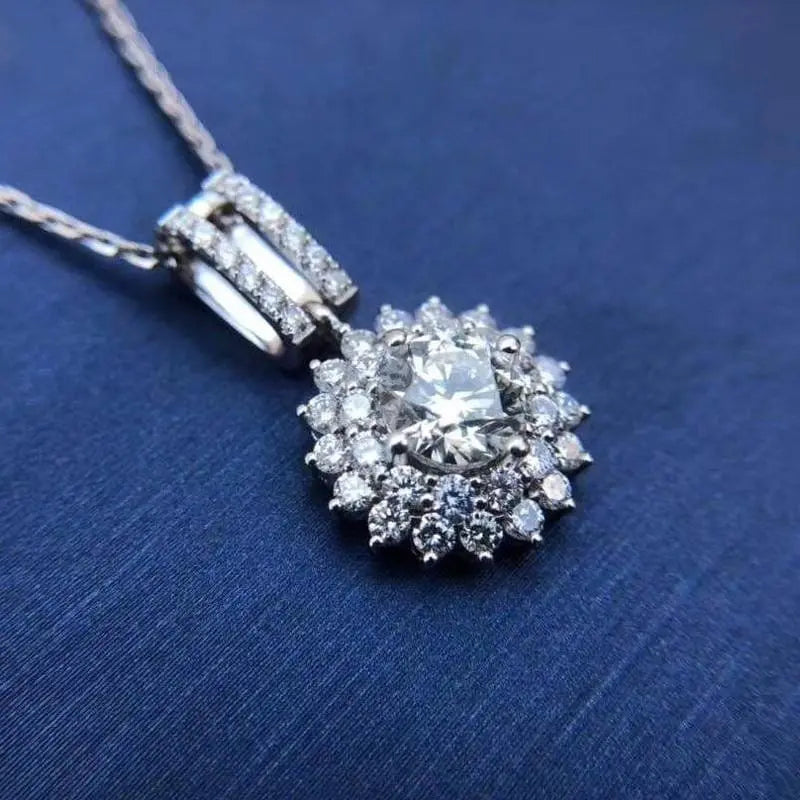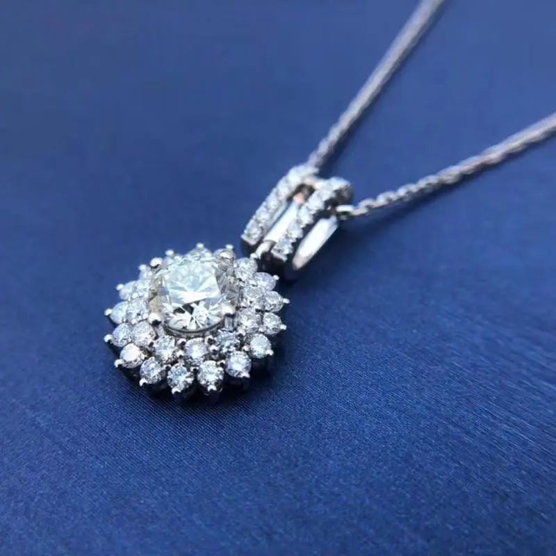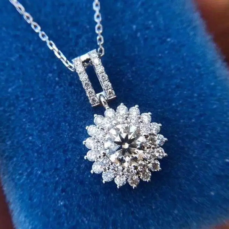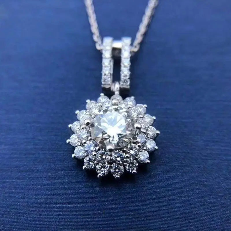 At the heart of this cute small necklace is a 1-carat (6.5mm) round-cut moissanite stone. renowned for its DEF color grade and FL-VVS1 clarity. The centerpiece is surrounded by a beautiful double halo of additional moissanite accents. amplifying its brilliance and creating a captivating sparkle from every angle.